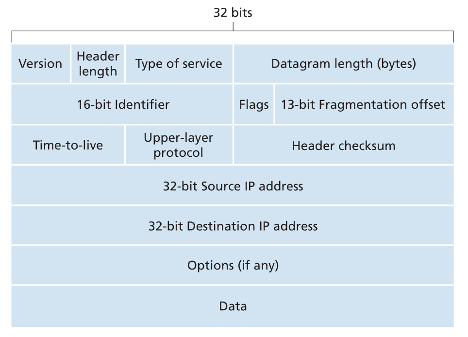 - identifier, flags, fragmentation offset。这三个主要是为了实现 IPv4 包的分片,即 IPv4 允许包在传输途中被切分(只要最终是完整的就行)。